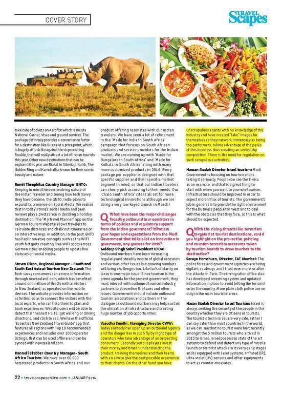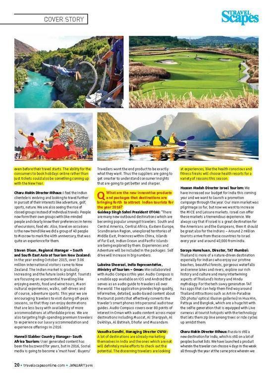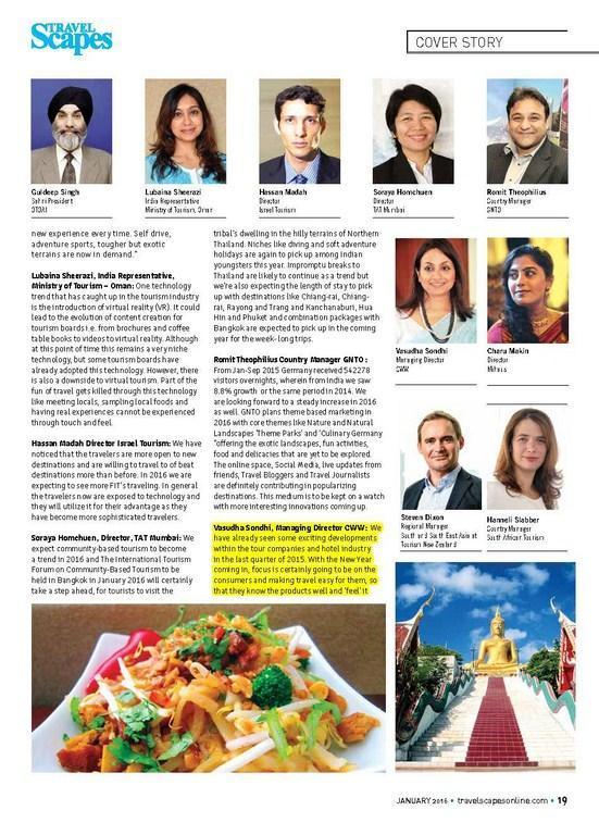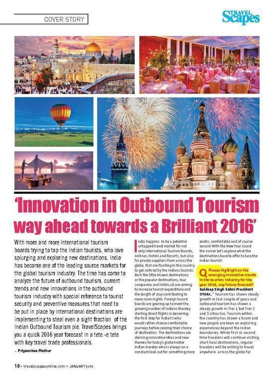 With more and more International tourism boards trying to tap the Indian tourists, who love splurging and exploring new destinations, India has become one of the leading source markets for the global tourism industry. The time has come to analyze the future of outbound tourism, current trends and new innovations in the outbound tourism industry with special reference to tourist security and preventive measures that need to be put in place by international destinations are implementing to steal even a sight fraction of the Indian Outbound Tourism pie. TravelScapes brings you a quick 2016 year forecast in a tete -e tete with key travel trade professionals. way ahead towards a Brilliant 2016’–– Priyanka Mathur