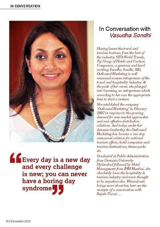 Having learnt the travel and tourism business from the best of the industry, SITA World Travels, Taj Group of Hotels and Carlson Companies, a generous and hard working Vasudha Sondhi, MD, Outbound Marketing is well renowned women entrepreneur of the travel and hospitality industry. At the peak of her career, she plunged into becoming an entrepreneur which according to her was the appropriate time to start a venture.